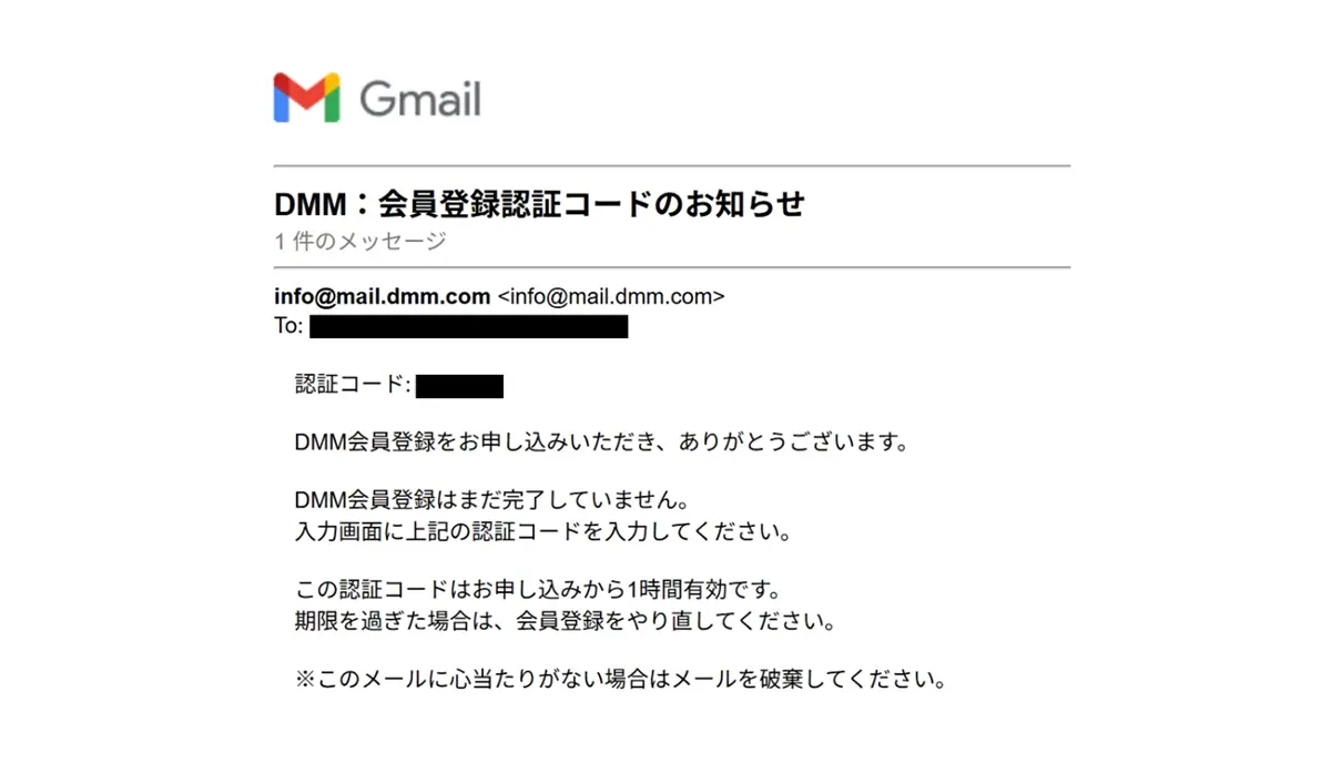 登録メールアドレス宛に「DMM」から「認証コード」が送られてくるので、次の画面で認証コードを入力する。