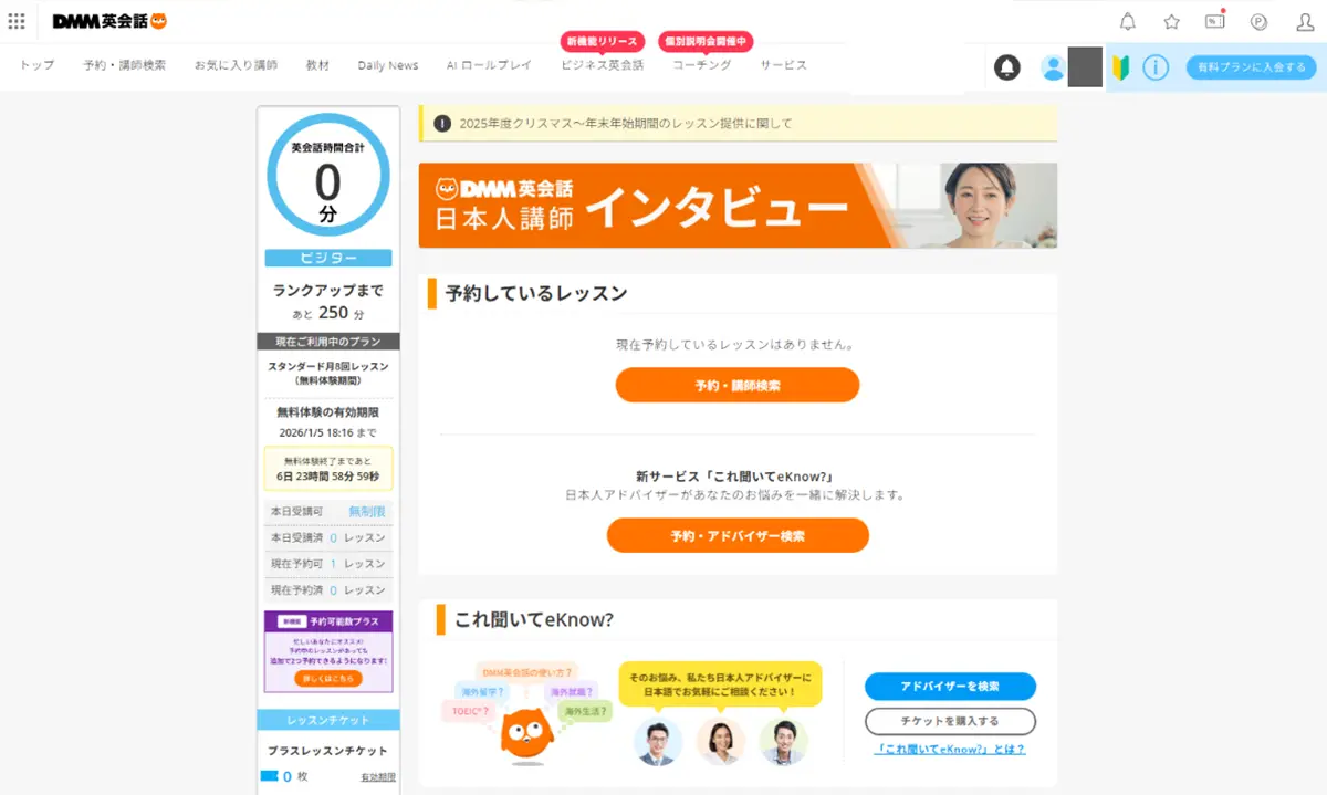 プラン入会後、トップ画面に戻るとダッシュボード画面が表示される。これでDMM英会話のアカウント登録完了!