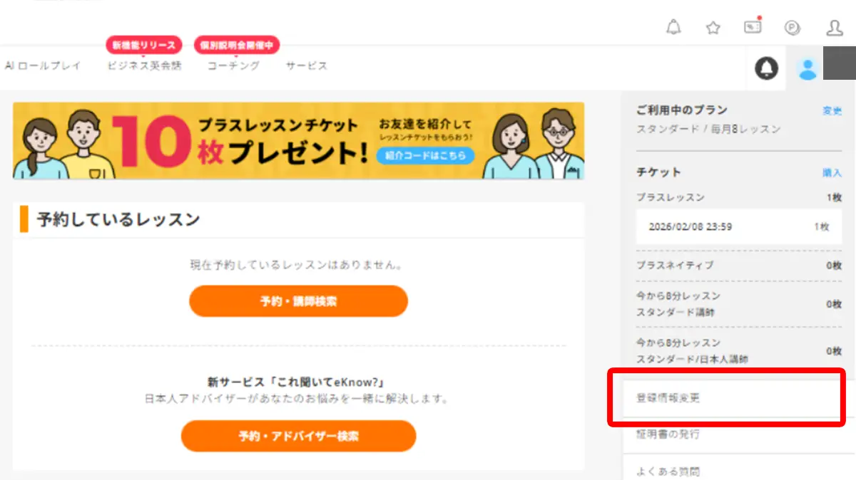 トップ画面右上の「DMM英会話アカウント」のアイコンをタップするとメニューが出てくるので、「登録情報変更」をクリック。