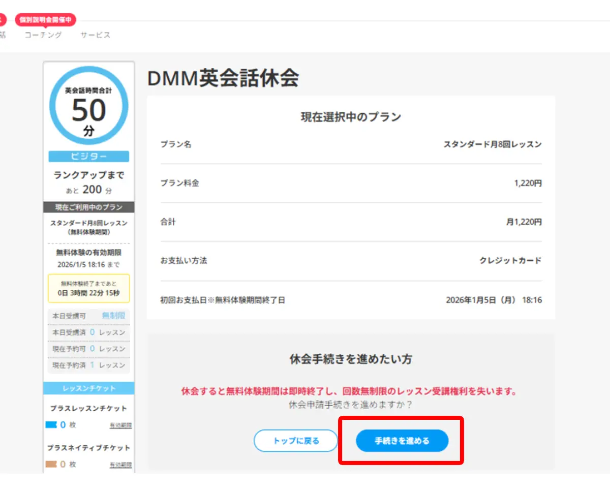 まず、DMM英会話アカウントにログイン後、休会中(または休会申請中)であることを確認。