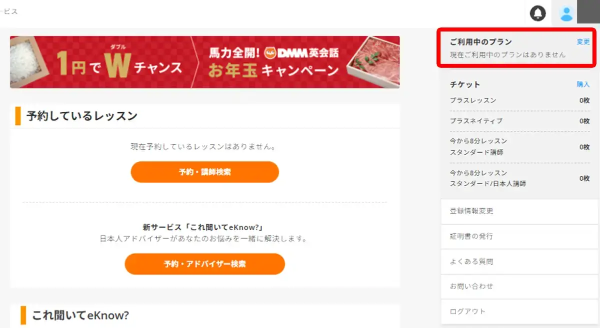 ※トップ画面右上の「DMM英会話アカウント」のアイコンをタップし、「現在ご利用中のプランはありません」と表示されていれば休会済。