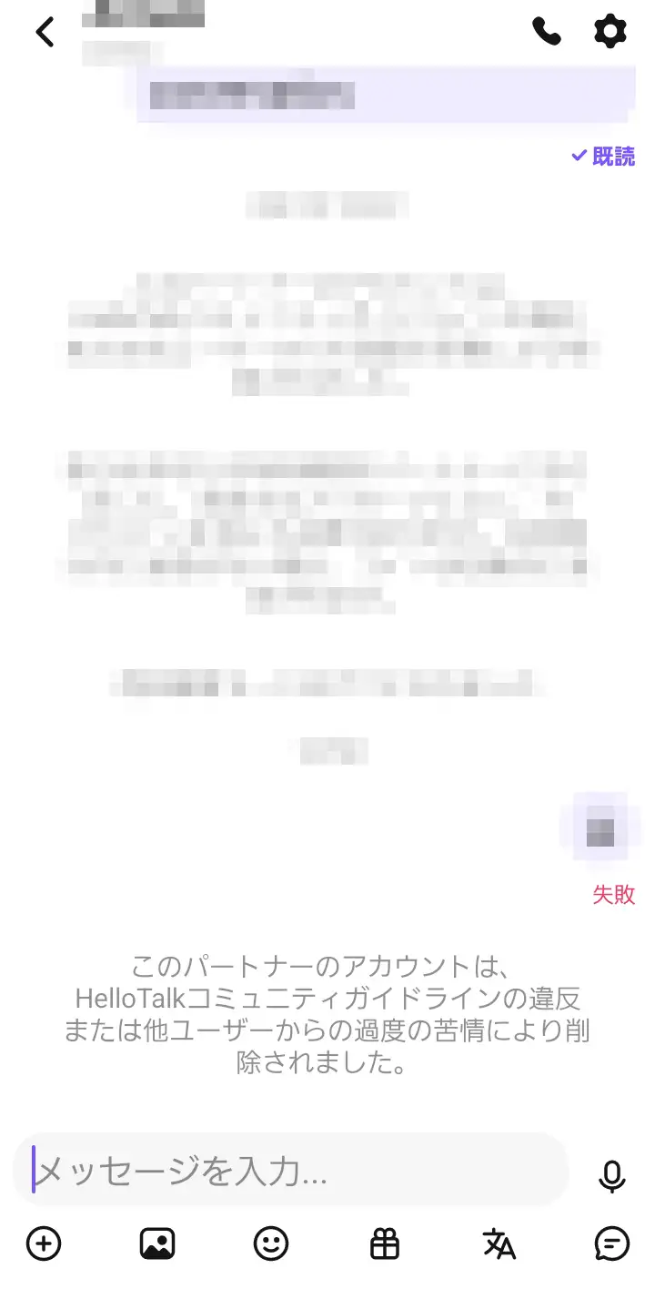 ただし、削除されたアカウントとの会話を開いても「このパートナー削除されました」といった表示が出て、途中から何かメッセージを送れなくなります。