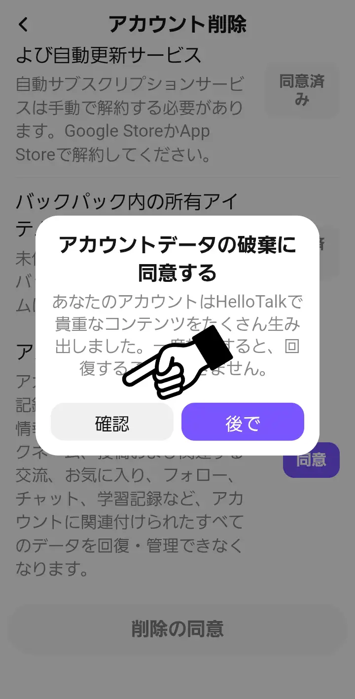 ⑦「アカウントデータの破棄に同意する」と表示されます。内容を確認しタップすれば削除が完了します。