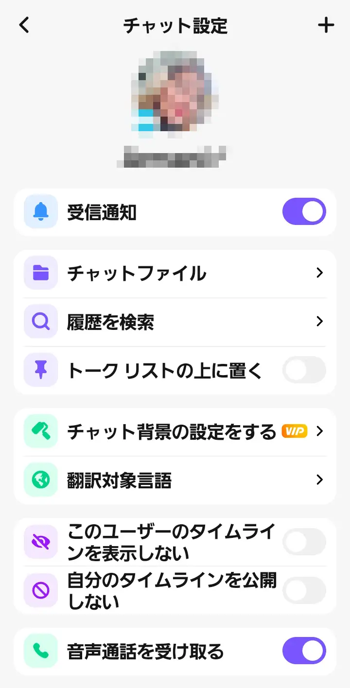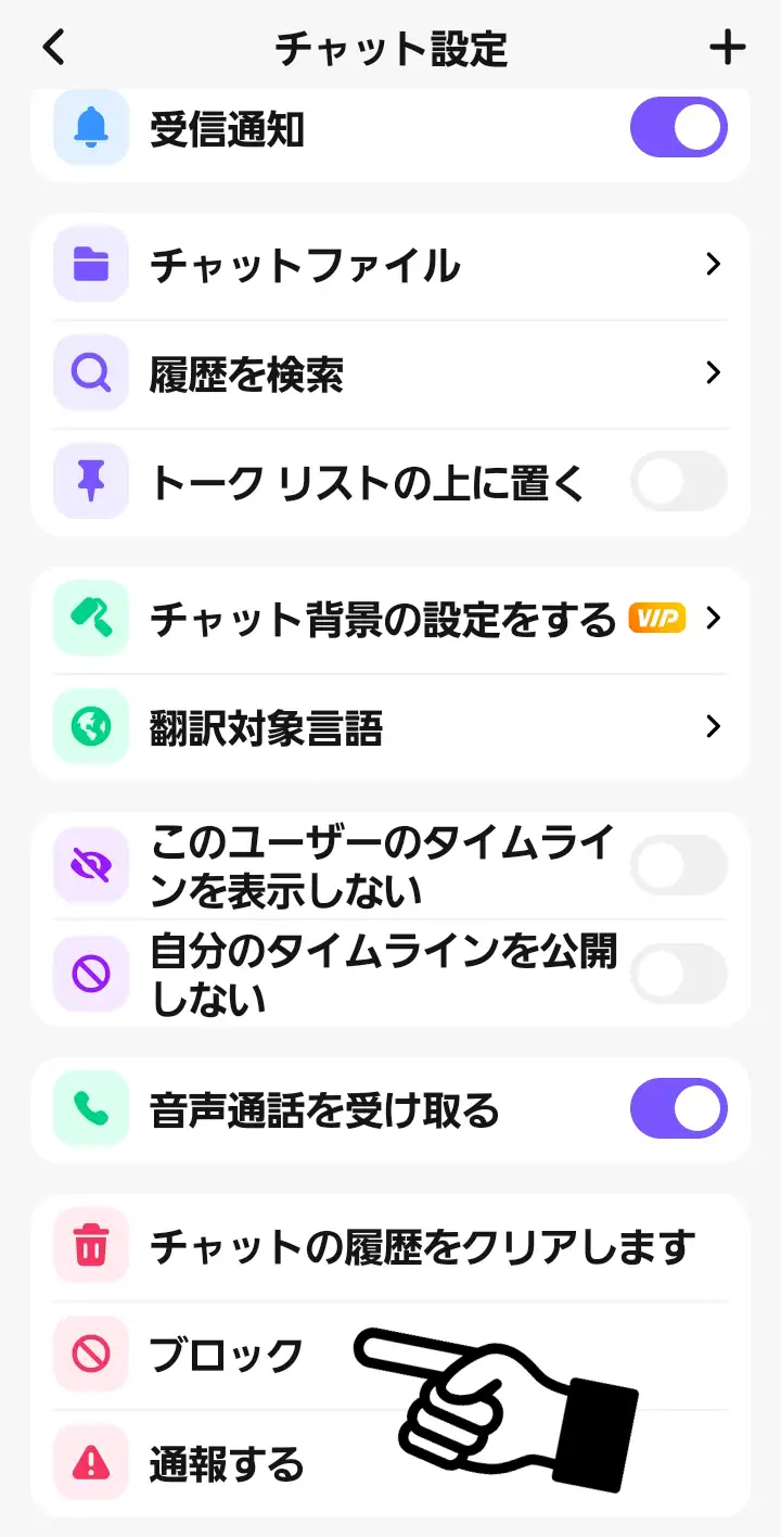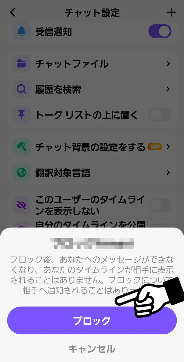 ブロックしたい人のチャット設定画面になります。
