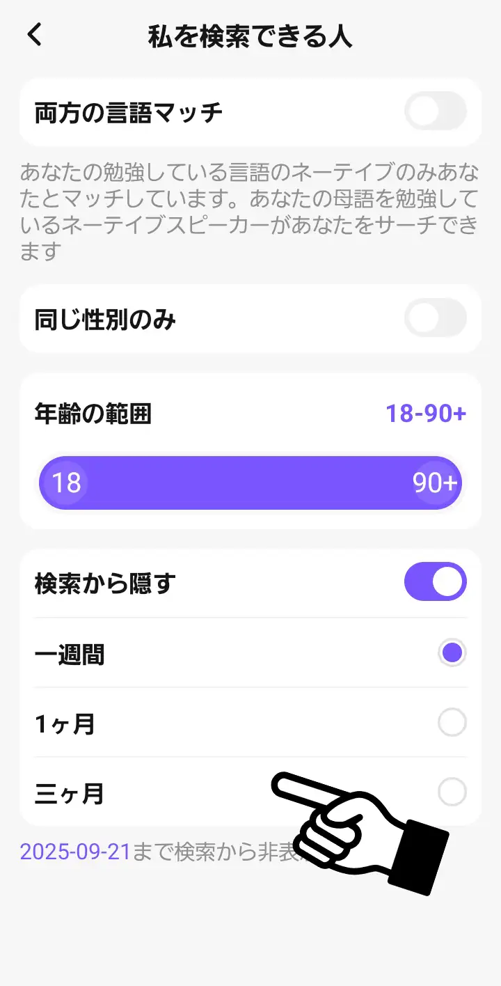 「検索から隠す」を選択すると隠す期間が出てきます。