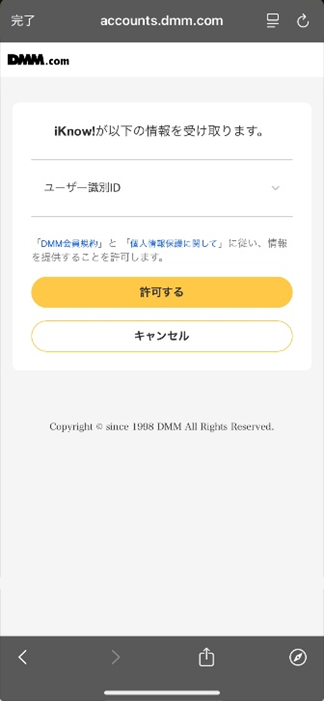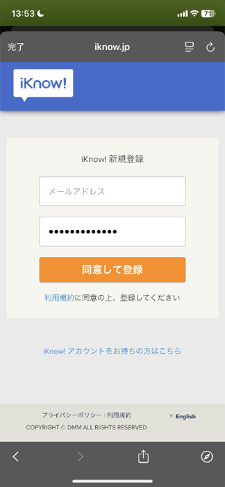 すでにDMM会員なので、そのアカウントでログインした後、iKnow!のアカウントに新規登録します。