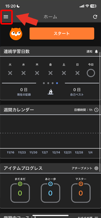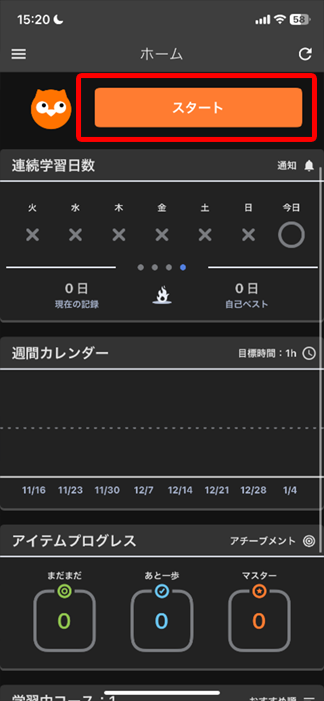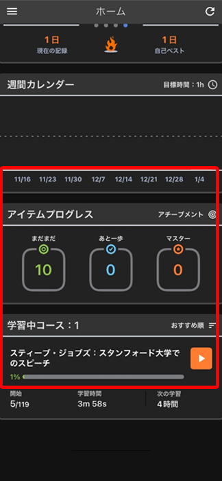 セッションが終了すると、ホーム画面の「アイテムプログレス」と進捗グラフが更新されるので、進捗度合いを把握しやすいです。