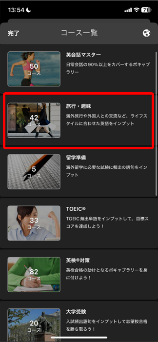 200以上のコースがあり、それぞれに合った目的・シーン別の単語やフレーズを学習できます。自分が強化したい目的やテーマに沿って選びましょう。