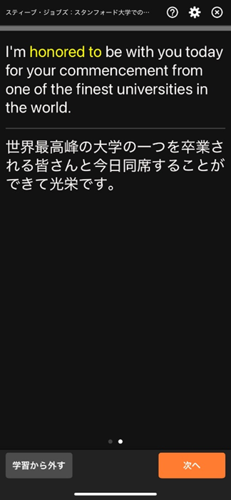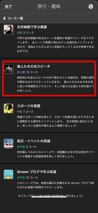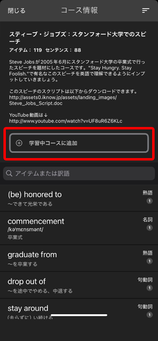 私は「旅行・趣味」のジャンルから「偉人たちの名スピーチ」を選択。その中から「スティーブジョブスのスピーチ」を「学習中コースに追加」してみました。