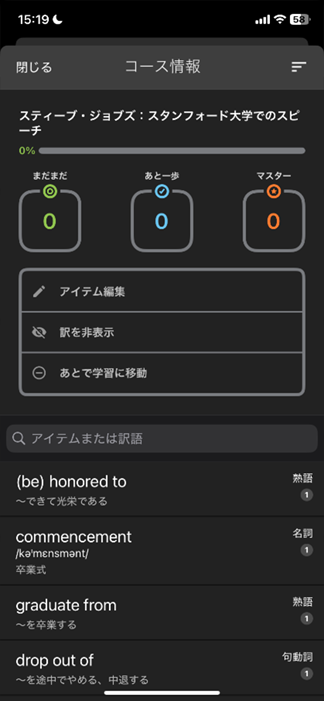 すると、「コース情報」が現れ、学習する単語やイディオムがずらりと並びます。