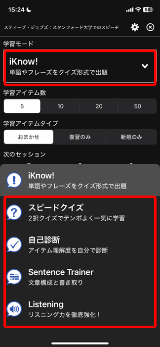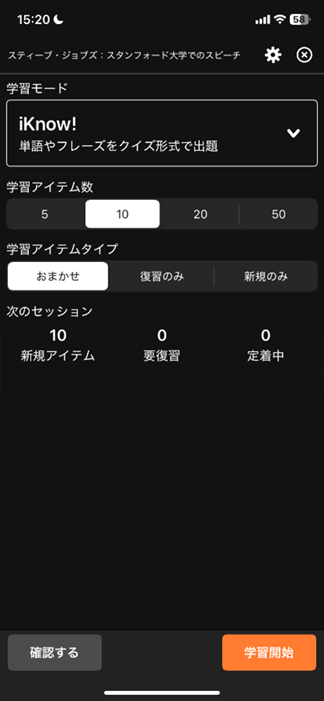 学習するモードやアイテム数などをカスタマイズできるので設定し、「学習開始」ボタンをタップしてセッションスタート!