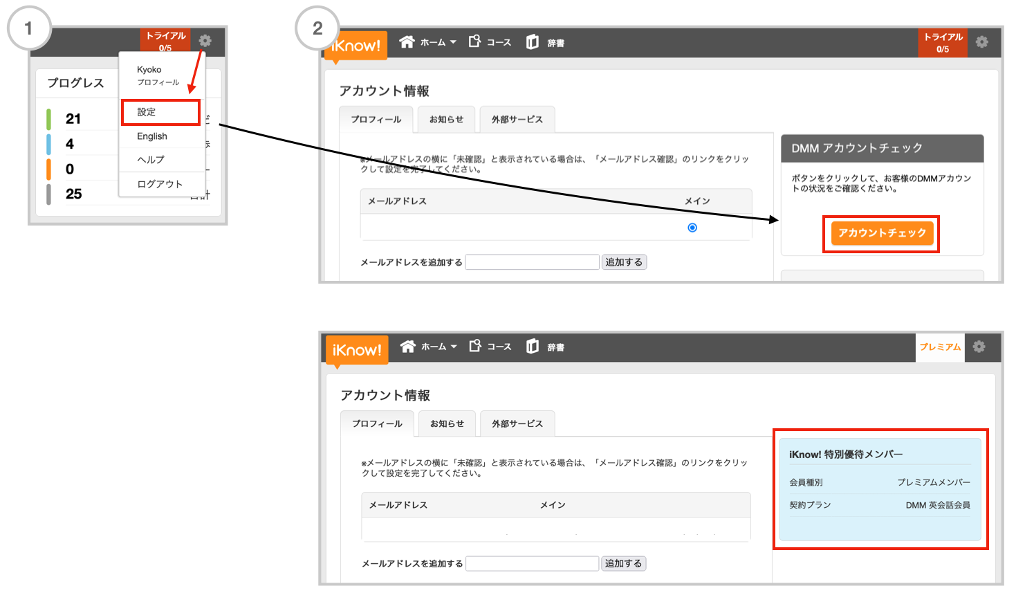 - アカウント連携チェックを試す iKnow!の設定画面(PCなら歯車マーク、アプリならメニュー)から「アカウント情報」を確認し、「DMMアカウントチェック」というボタンを押してみてください。これでステータスが更新されることが多いです。