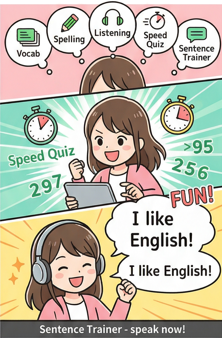 特に「スピードクイズ」はテンポが良くて、ゲーム感覚でどんどん進められるのがお気に入りです。文章を組み立てる「Sentence Trainer」も、実際の英会話でフレーズがパッと出てくる訓練になるので、ただの単語暗記以上の手応えを感じました。
