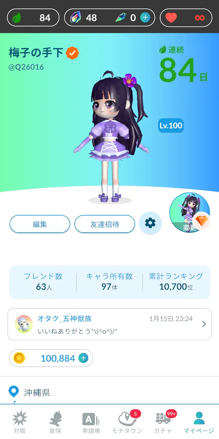 プレミアムにも入ったし、ログインも毎日しているみたいだし、レベルも100?いってる?