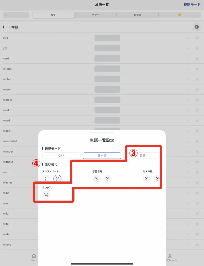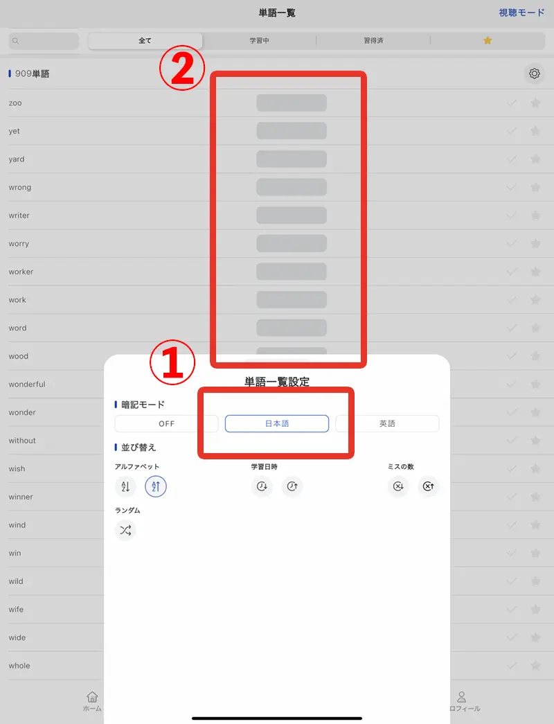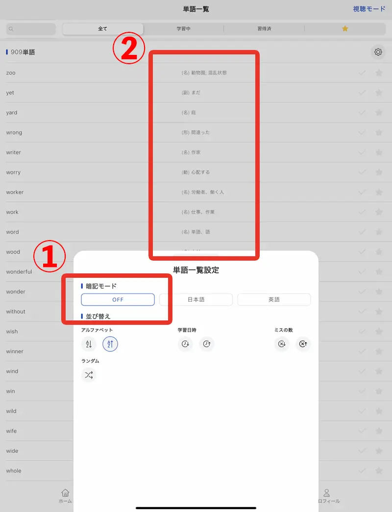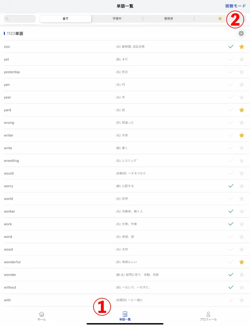 ①下の「単語一覧タブ」をタップし、②「視聴モード」をタップ
