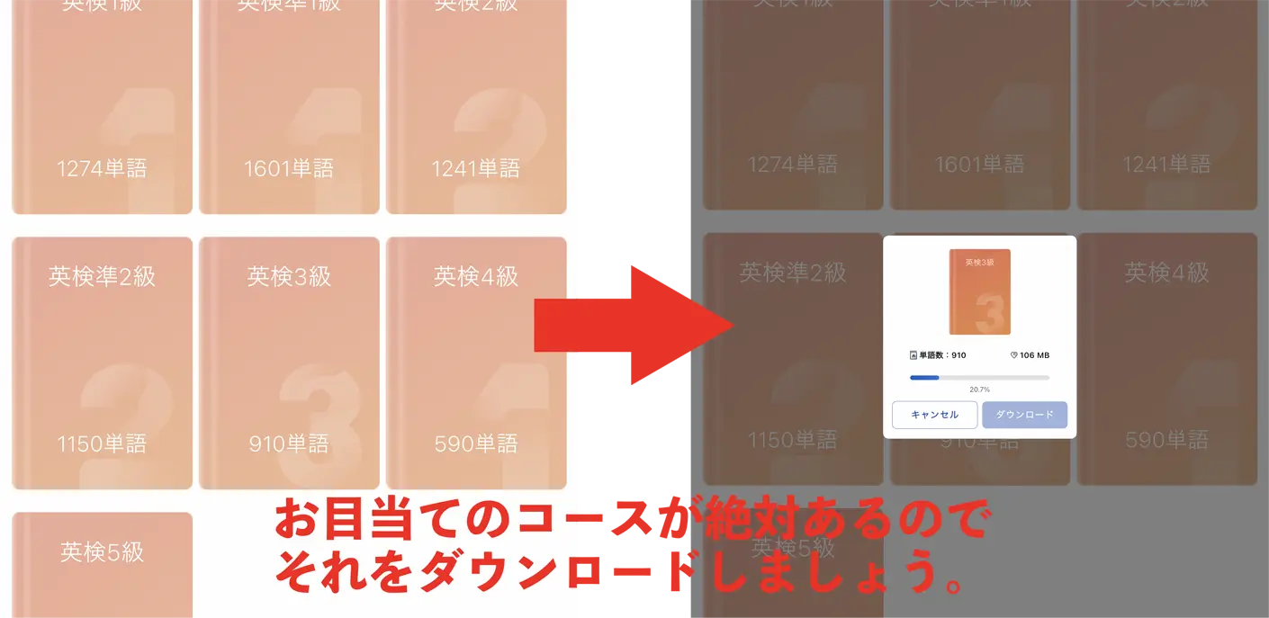 英検対策5級〜1級(全7級):級別の頻出単語を網羅。合格に必要な語彙をステップアップして習得。