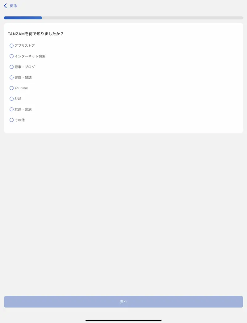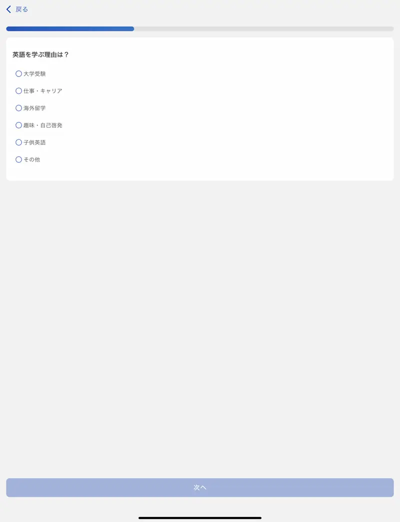 最初に下記の様な簡単なアンケートと教材選びがあり、本当に2~3分で終わります。
