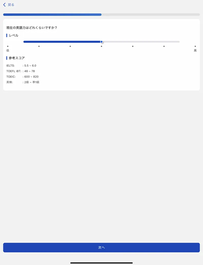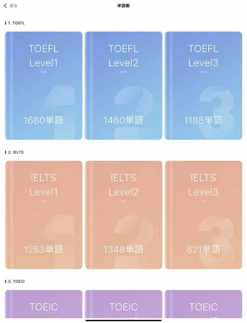 海外留学TOEFL(60-100点)/ IELTS(6.0-7.0):各3段階のレベル。アカデミックな難単語も映像で攻略。