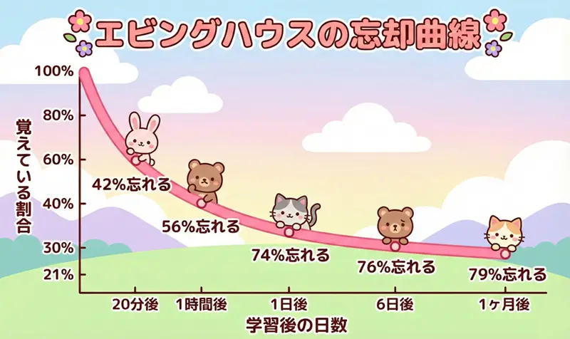「エビングハウスの忘却曲線」という言葉、聞いたことがあるかもしれません。人間は、何かを覚えても1日後には約7割を忘れてしまう生き物です。