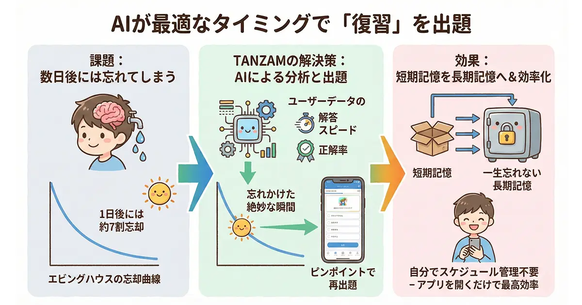 「せっかく覚えたのに数日後には忘れている…」という悩みも、AIが解決してくれます。TANZAMは「エビングハウスの忘却曲線」に基づいて、あなたが忘れかけた絶妙なタイミングで復習クイズを出してくれるんです。